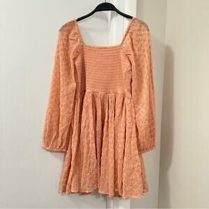 Simple yet chic, this mini is featured in a feminine eyelet fabrication and long-sleeve style with gathered skirt detail and a stretchy smocked back.