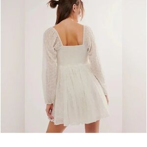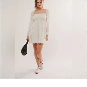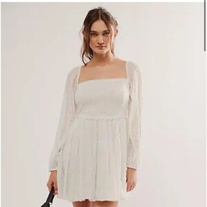 Simple yet chic, this mini is featured in a feminine eyelet fabrication and long-sleeve style with gathered skirt detail and a stretchy smocked back.