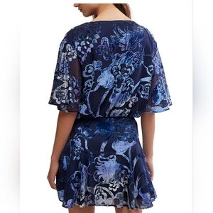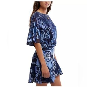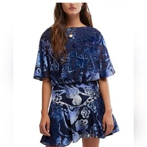 A soft velvet burnout design swirls over Free People's mini dress, bringing an air of elegance to the relaxed shift silhouette.