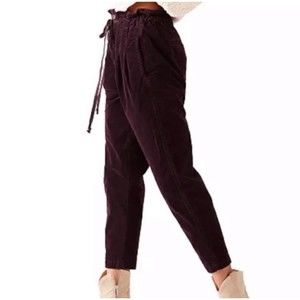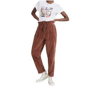 Free People Margate Brown Pleated High Rise Paper Bag Corduroy Ladies Trousers. Four Pocket Style. Drawstring Waistband.