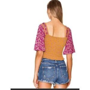 Free People Marigold Smocked Top in Golden Combo. Size S. Gold/Pink Leaf and Floral prints. Square neckline, Smocked bodice, Short flare sleeves. Excellent preowned condition.