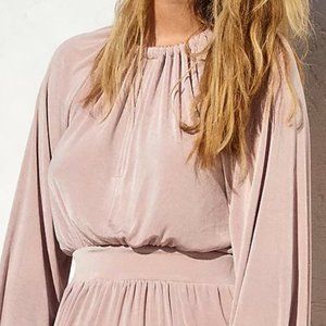 Features: Pleating throughout, defined waist, curved bottom hem, keyhole back tie closure, banded sleeves