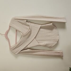 Free People Marley cross front long sleeve top in beige, off shoulder, dolphin hem, waffle knit.
