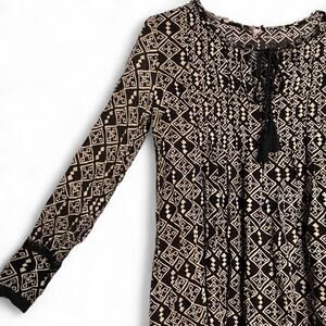 Free People Marlow Size XS Black Cream Boho Swing Dress Peasant Tunic Tie Neck