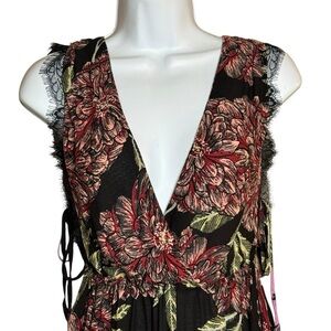 Free People Marnie Floral Plunge Tie Side Swing Mini Dress Black/Plum Sz XS