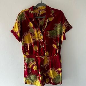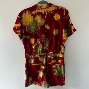 Free People Maroon Red Palm Print Linen Button Front Collared Romper Size M