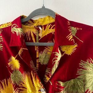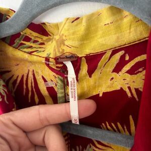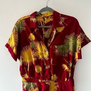 Free People Red Linen Button Front Collared Jump Suit Size M Tropical Botanical