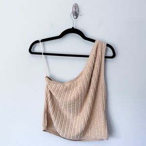 Features a sleeveless, one-shoulder silhouette with classic ribbed knit throughout for added texture