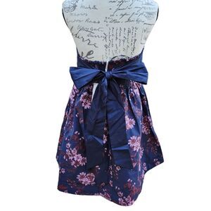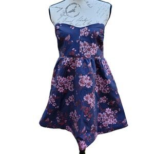 Pretty and party-perfect, this strapless mini dress is covered in delightful blooms and fashioned with back smocking and handy pockets.