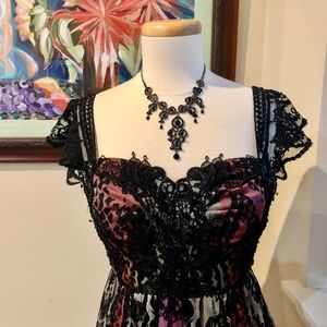 Bodice is black lace applied to netting and embroidered with beads by hand. In the front the lace is overlayed on the snake print fabric.