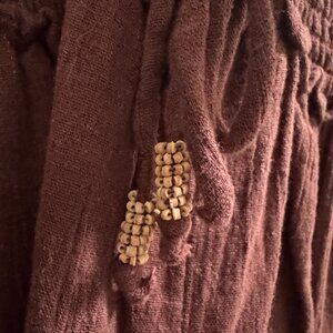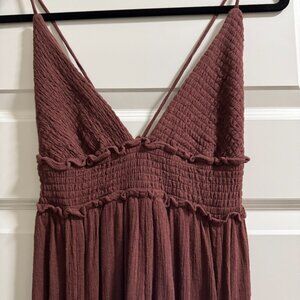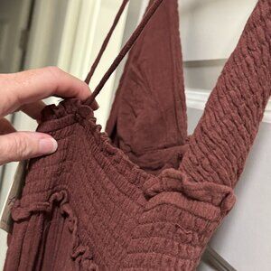 This Free People maxi dress is brand new with tags in size small. It features a solid brown color, sleeveless design, halter neckline, and is made of a comfortable cotton linen material. The long dress length makes it perfect for casual occasions, with a beach theme that adds a relaxed and stylish touch. Perfect for women looking for a chic and comfortable outfit for various casual events.