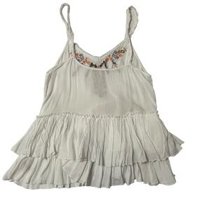 Beautiful Free People Meadow Ballerina Top in white with multicolor embroidered detailing at the neckline. Features a tiered ruffle hem and braided spaghetti straps. Flowy boho silhouette, perfect for layering at festivals, summer, or casual chic looks.