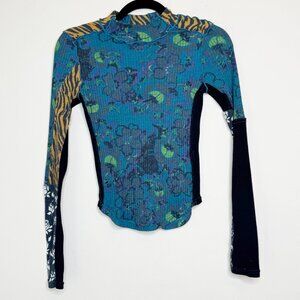 Free People Meadow Mix Tee Blue Combo • Long Sleeve Patchwork Mock Neck Size XS