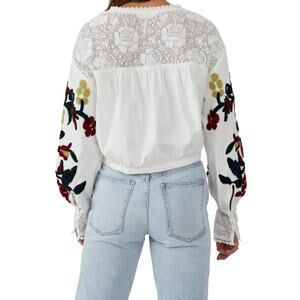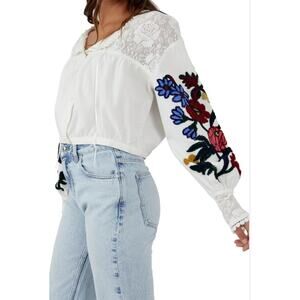 Free people fresh white blouse with lace panels on yoke and back. sleeves feature stunning tufted floral embroidery in a perfect-for-fall color pallet. top has button down front and slightly cropped length.