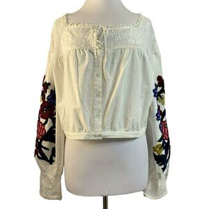 Free People Meadows Embroidered Peasant Top Artsy Hippie Boho Cropped Sz M NEW
