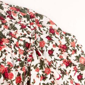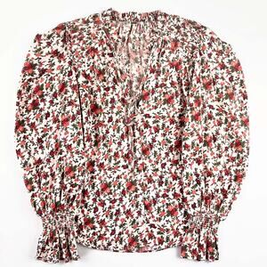 The blouse includes pleated shoulder detailing, adding a touch of sophistication to the blouson sleeves. The small ruffling at the neckline adds a delicate, feminine touch, complementing the button-up front with a tie closure. Smocked cuffs provide a comfortable and stylish fit, while the scooped bottom hem adds a flattering silhouette.