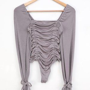 Brand new and never worn Free People Meant To Be Shiny Purple Ruched Long Sleeve Bodysuit! Shiny metallic stretch knit shapes this chic bodysuit that has a square neckline and long trumpet sleeves with tying accents at the wrists and elastic at the shoulders. The fitted bodice is accented with two cinched panels that create a gorgeous ruching effect. Attached thong bottoms have snap closures.