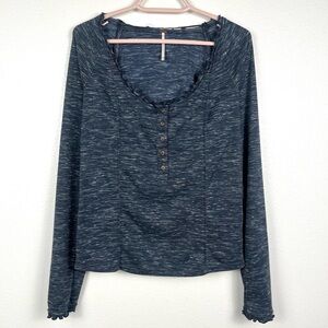 Free People Medium Roxy Blue Space Dye Ruffled Long Sleeve Henley Top