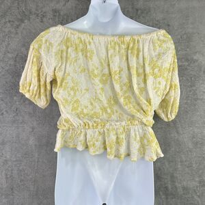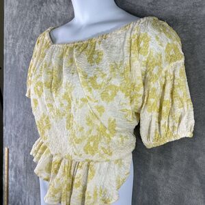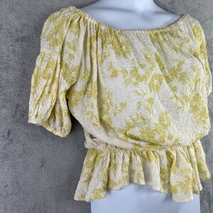 Free People Medium Yellow White Blouse Peplum Cropped Top Off Shoulder