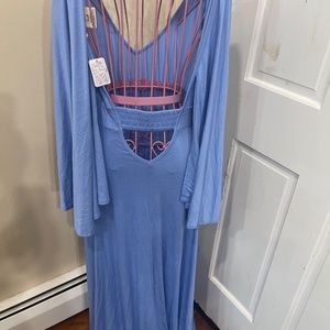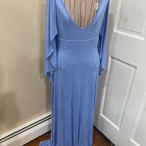 American made lightweight and stretch maxi dress featuring a statement cape-like long sleeve.