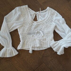 Free People Megan Crochet Open Back Long Sleeve Eyelet Crop Top Ivory Sz S Boho