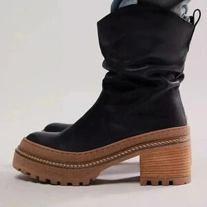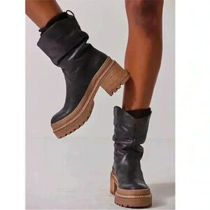 Features: Ankle length, pull-on style, leather uppers, slouchy design, dipped topline, layered platform sole, chunky block heel, pull tab, tread rubber outsole