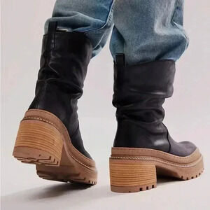 Features: Ankle length, pull-on style, leather uppers, slouchy design, dipped topline, layered platform sole, chunky block heel, pull tab, tread rubber outsole