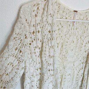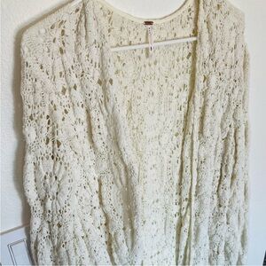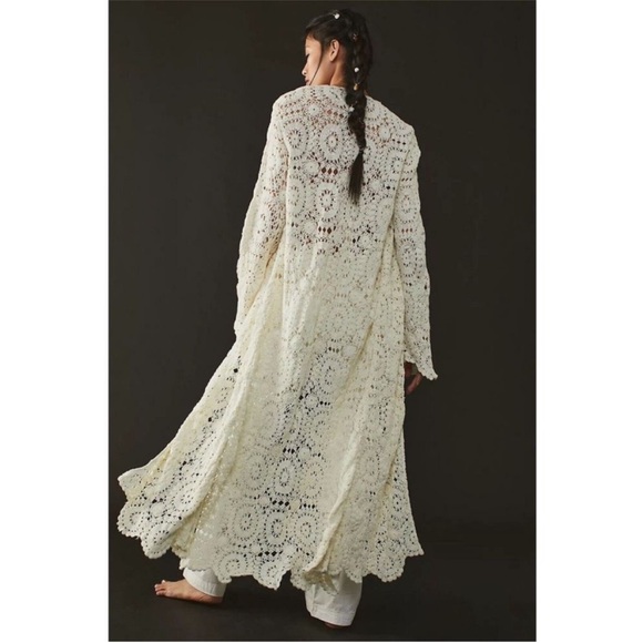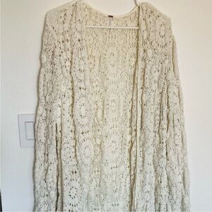 The perfect touch to any look with this forever timeless crochet duster featured in a classic long-line silhouette with defined sleeves and a scalloped bottom for added dimension