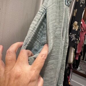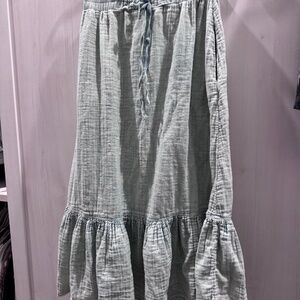 This pre-loved midi skirt is super comfortable and light. It's elastic waisted with a tie, to make it tighter. It has pockets!!! Material is gauze like. Coming from a smoke free home
