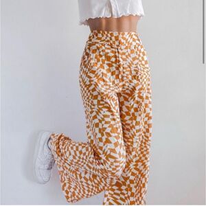 Free People Menorca psychedelic check Wide-Leg Cropped Pants in a brown mustard, color and white with double hook and zip closure. Dopamine and maximalism approved. 100% lightweight cotton. Hip pockets. High-rise. Laying flat measures 13 inches straight across the waist with a 12 inch rise and just shy of 27 inch in same. The leg opening is generous at 14.5 inches wide at the hem. No back pockets.