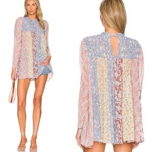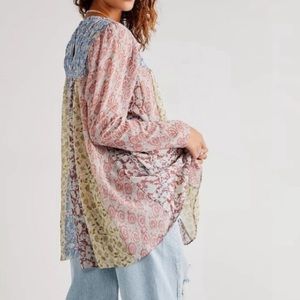 Free People Merrie Mix Print Colorblock Colorful Tunic Top Ruffle Neck Detail
