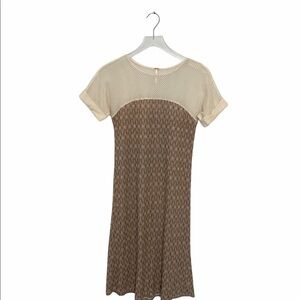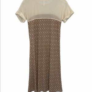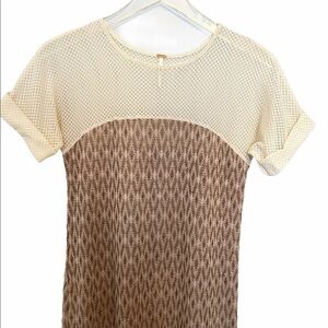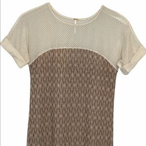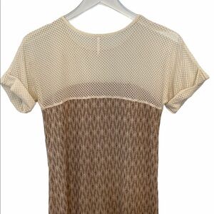 Lightweight and sparkly Free People mesh bodice dress with gold metallic thread running through the body. Sleeves are folded twice. Dress is A-line. The ivory bodice is somewhat sheer; the gold/pink body of the dress is not. Floaty and airy, chic for the summer and beyond. Excellent pre-owned condition. Size XS.