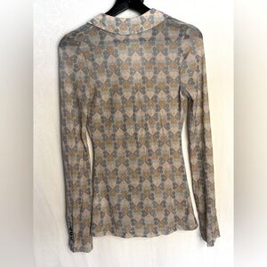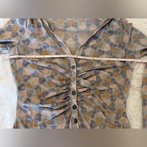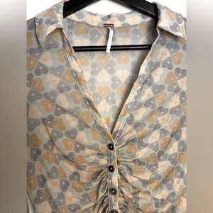 Free People Mesh Rouched Long Sleeve Button Down Blouse Top Heart Print XS