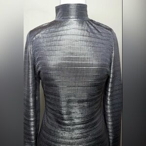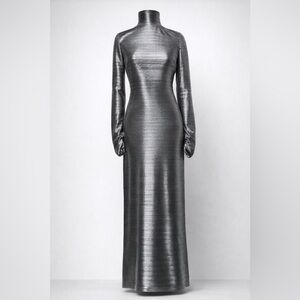Stunning Free People metallic open-back maxi gown in a sleek silver ribbed stretch fabric. High mock neck, long ruched sleeves, and a dramatic scoop back with covered button closure. Fabric is thin, unlined, and very stretchy — moves beautifully and works in any season.