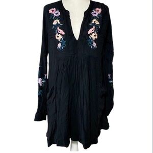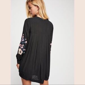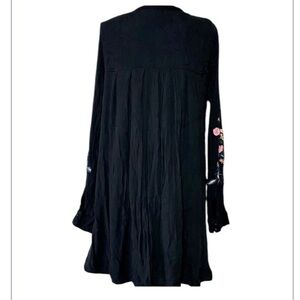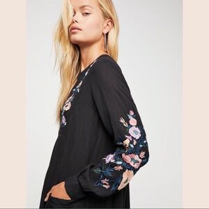 Free People Mia mini swing dress in black. V neck. Ballon sleeves with button cuffs. Embroidered neckline and sleeves. Pockets. Lined. Viscose. Machine wash. Excellent condition. Size M