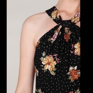 Free People Floral Polka Dot Halter Maxi Dress in comfortable and stretchy cotton jersey. Floral / botanical and Polka Dot Print, Jersey Halter Neck, Popover Style, Side Slit.