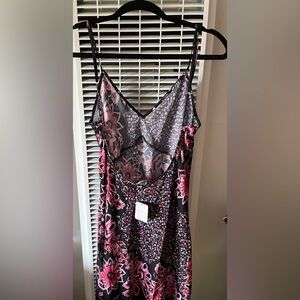 Never worn. Open back. Tag attached. Adjustable straps. Pit to pit 19 inches. Hips 40 inches. Length shoulder to hem 50 inches. Doggies live here.