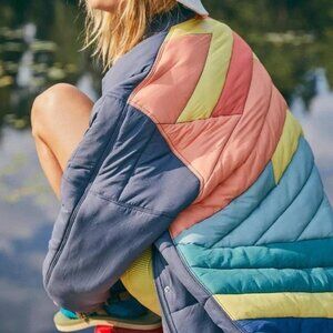 Your new go-to puffer coat featured in a cool and classic bomber contour with color blocked detailing at back for added dimension.