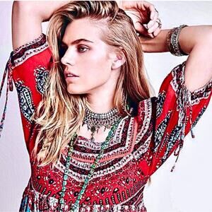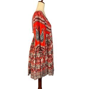 A gorgeous FP boho chic mini dress in a stunning shade of poppy red, with an ivory, blue gray & black mixed floral & paisley print. Festive, charming, effortlessly flattering & beautiful.