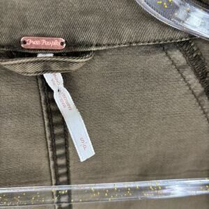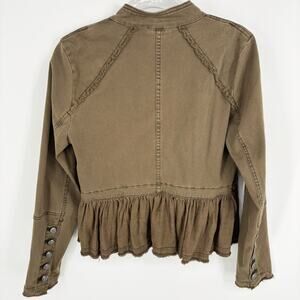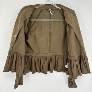 Elevate your wardrobe with this military green crop jacket from Free People. The ruffle and frayed hem details add a touch of bohemian and modern flair to this casual button closure jacket. The cotton blend twill fabric makes it perfect for fall and spring seasons.