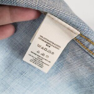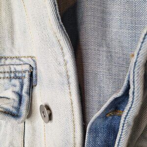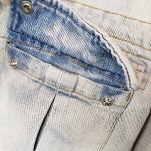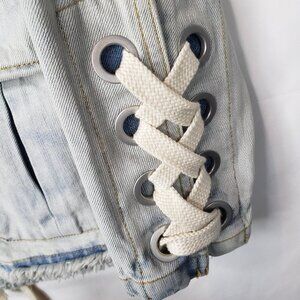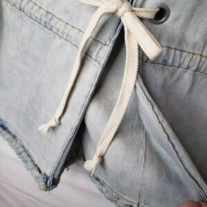 Light wash, thick denim. Grommet and ribbon detail at the back and forearms. Looser, military style. Pockets and drawstring waist. Raw hem.