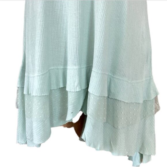 Description: Free People Mini Dress Mixed Media Ribbed Knit and Swiss Dot with Mesh Lace Accents and an asymmetric Triple Ruffle Hem.