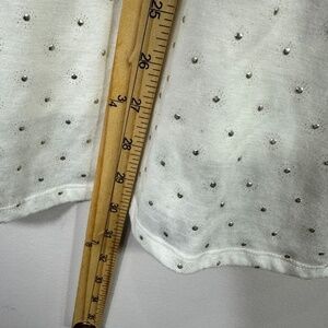 This Free People mini dress features a scoop front and back neckline, long sleeves, and a fitted silhouette. The white fabric is adorned with scattered rhinestones for a touch of sparkle. Note: some visible discoloration on the sleeve (see photos). Still a beautiful option for layering or events.