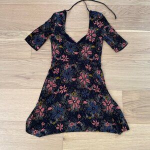 Cute black minidress in a stretchy fabric with a tie in the back. In excellent preowned condition and comes from a smoke and pet free home.