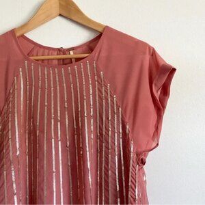 Features: Soft fabrication with a lightweight feel, scoop neckline, sequin detail throughout, rolled sleeve detail, ruffled bottom hem, separate slip lining