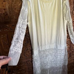 Free People. Made in India. Light mint green color. Delicately laced sleeves and skirt. New, no tags. Size small. 72% cotton 28% linen, lace 100%polyester. New with no tag.