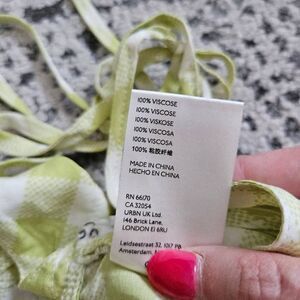 Features adjustable tie straps, soft lightweight viscose fabric. The bib part is meant to sit lower around your waist but you can tie it wherever feels comfortable. Bought this for myself but didn't love it on.