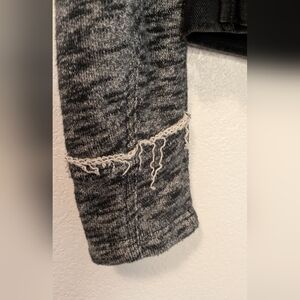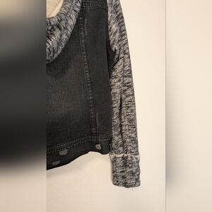 Stylish women's denim jacket featuring a classic black body with contrasting gray sleeves. Perfect for casual outings and adding a trendy touch to any outfit. Distressed throughout, removable hood.