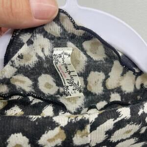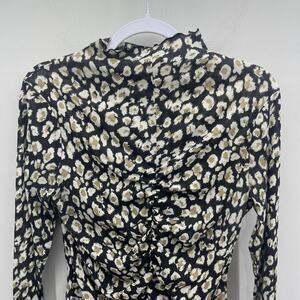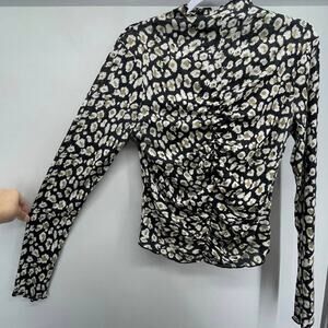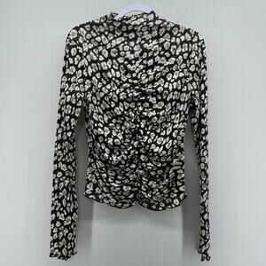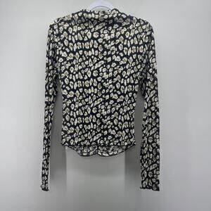 Free People Mock Neck Scrunch Front Black Tan Leopard Print Mesh Long Sleeve Top