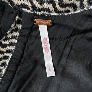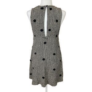 Free People Mod Mini A-Line Jumper Dress Size S Woven Polka Dot V-Neck Pockets. Dress is in good preowned condition. The cotton-viscose shell is a loose weave, and there are a few minor pulls on the fabric, as well as on some unraveling of the puffy polka dots. (Please see last photo for example.) Wavy black and beige stripe with puffy embroidered black polka dots. Deep v-neck in front. Button closure in back creates large open keyhole. Large armholes. Loose A-line cut. Side seam pockets. Fully lined in soft modal.